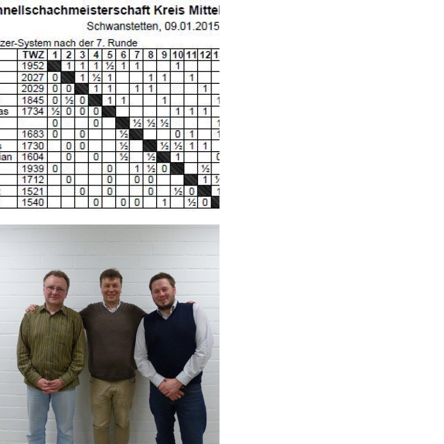 13 Schachfreunde aus 5 Vereinen fanden am 09.01.2015 den Weg nach Schwanstetten zur Schnellschachmeisterschaft des Schachkreises Mittelfranken-Süd. Nach 7 Runden mit einer Bedenkzeit von 15 min. pro Spieler und Partie setzte sich Karl Beck vom SC Markt Berolzheim souverän mit 6,5 Punkten durch. Sicherlich hatte er bei seinem Start-Ziel-Sieg auch etwas Glück, insbesondere in der Partie gegen Frank Leonhardt, den er mit Minusfigur im Moment des Blättchenfalls matt setzte. Doch bei dieser kurzen Bedenkzeit ist die Schachgöttin Caissa ohnehin immer mit dabei.