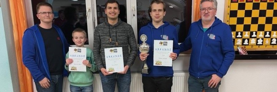 Sieger wurde wie im Vorjahr Nico Herpich von unserem Verein. Da er jedoch außer Konkurrenz startete, wurde wie im Vorjahr der zweitplatzierte Thomas Hollmann vom gastgebenden Verein Kreismeister. Vizemeister knapp dahinter wurde mit einer beachtlichen Leistung der jüngste Teilnehmer des Feldes, Maximilian Mitin. Er konnte damit an seine guten Leistungen bei den Jugendkreismeisterschaften anknüpfen, wo er in den Altersklassen u10 und u14 siegte. Er prüfte alle vier Spieler des SK Schwanstetten und gab dabei nur einen halben Punkt ab.