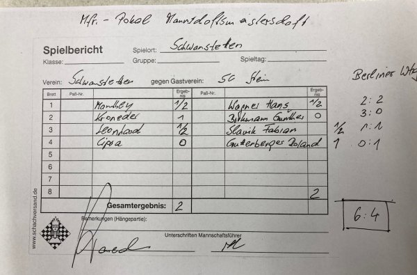 Zum Matchwinner wurde Christian, der seinen Gegner mit Turm und Dame auf der a-Linie eindringen ließ, um ihn dann selbst mit Dame und Springer im Königsangriff auszukontern. Dadurch konnte Frank seine ausgeglichene Schwarzpartie in aller Ruhe nach 55 Zügen zum Remis führen, denn dies brachte uns beim 2:2 den Mannschaftssieg nach der "Berliner Wertung".